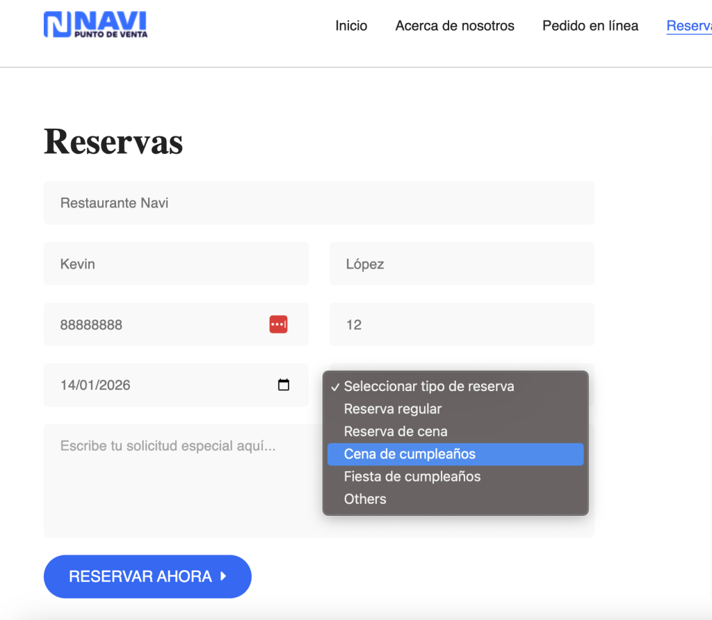 Autogestión de reservas integrado, cliente elige dia y hora. Todo en un solo lugar, recibes la notificación en el POS y podrás aceptar o rechazar e incluso contactar al cliente de forma externa para pedir más detalles.